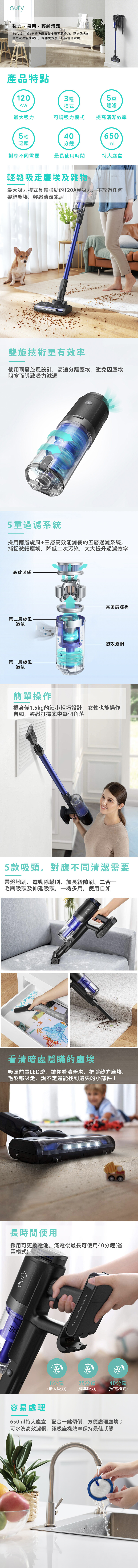 - 內附: 牆架配件,帶燈地刷,AC充電器,金屬吸管,加長縫隙吸頭,二合一縫隙吸頭,伸延吸頭,電動除蟎吸頭