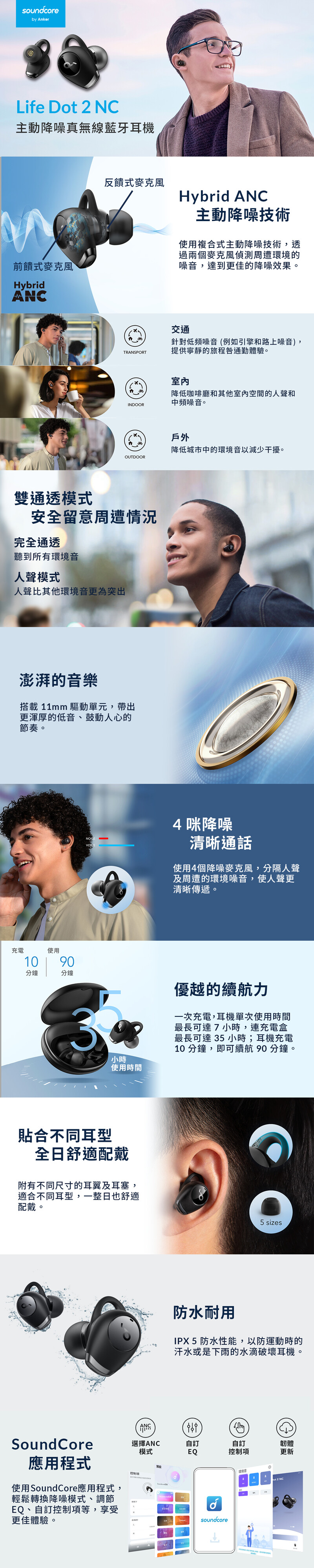 - SoundCore 應用程式: 自訂控制項、自訂EQ、使用HearID、通透模式...