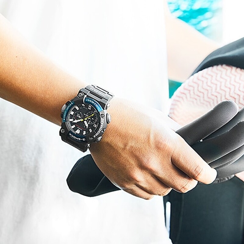 歡迎使用指針式 G-SHOCK Master of G Frogman 手錶(合成錶帶)。這些手錶專為潛水員而設計,GWF-A1000XC 的中間框架採用優質樹脂,GWF-A1000C 的中間框架採用碳增強樹脂,既耐用又輕便。合成錶帶搭配帶延長件的錶扣,可輕鬆套在潛水服上。這些特殊的 Frogman 手錶在款式和顏色上也毫不遜色。搭配靚麗的藍色離子鍍不銹鋼錶圈,秒針採用鮮豔而奪目的黃色。也可選擇一種獨一無二的潑色設計,包括層壓碳錶圈中的單一橙色層到大膽的橙色鑲嵌錶盤環。