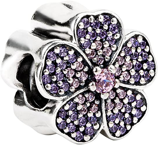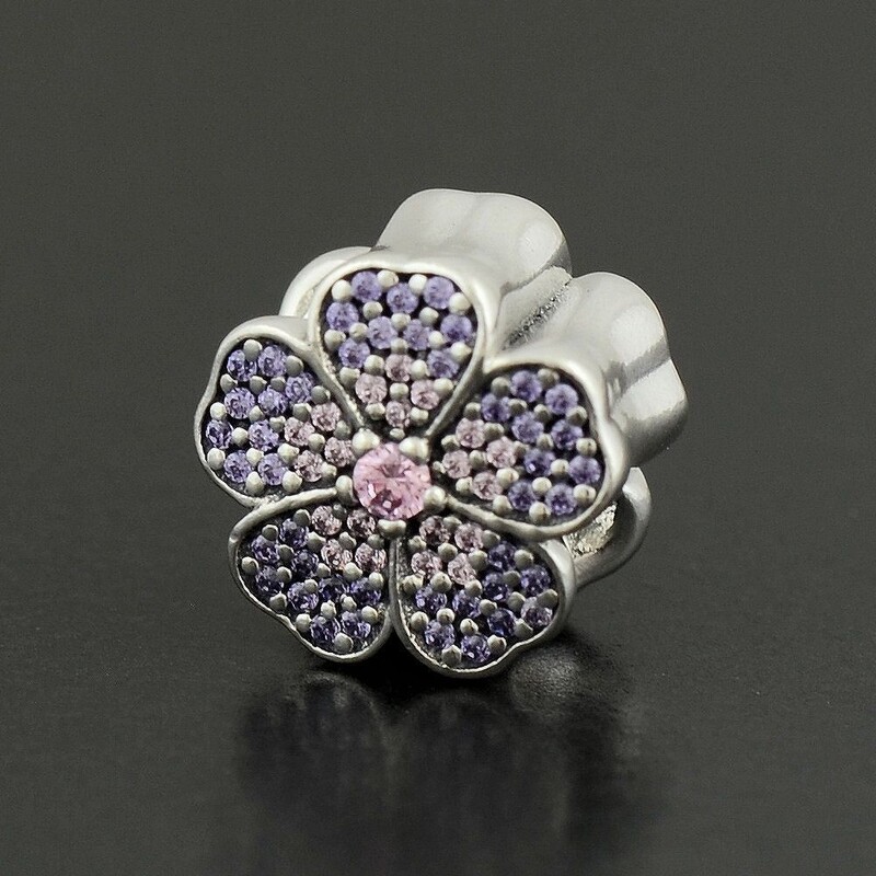 A colourful primrose charm by PANDORA, crafted from sterling silver and set with glittering stones in pastel pinks and purple.