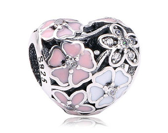 An opulent floral heart charm in sterling silver by PANDORA, featuring a cluster of pink and white enamel flowers topped with clear cubic zirconia stones.