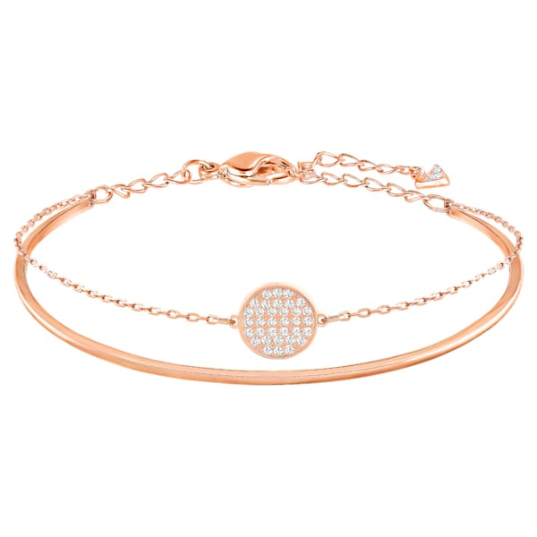 這款時尚嫵媚的鍍玫瑰金色手鐲,以硬朗的金屬環設計,搭配精緻閃亮,帶有密鑲Swarovski水晶吊牌的飾鏈,型格十足,此手鐲與其他Swarovski首飾完美配襯,是每個首飾盒中的必備配飾。