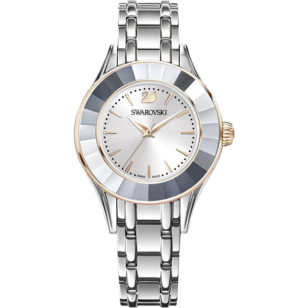 這款時尚迷人的手錶,帶有閃爍悅目的淺鉻色切割Swarovski水晶錶圈,並以驚豔手法揉合了不銹鋼與玫瑰金色金屬素材﹔創新別緻的色彩組合,盡顯Swarovski的創作特色之餘,更為時下流行的鍍層混搭設計賦予精緻優雅的詮釋。配合銀白色放射線圖紋錶盤與不銹鋼錶帶,是搭配日常服飾的百搭之選。錶殼 - 33毫米﹔50米防水功能﹔瑞士製造。