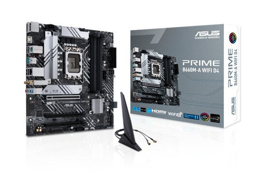 ASUS PRIME B660M-A WIFI D4 提供時尚、未來主義的外觀,採用黑白飾面、航天飛機風格的設計元素、金屬銘牌和 PCB 蓋。