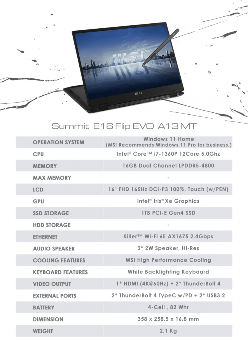 MSI Summit E16 Flip EVO A13MT i7-1360P / Iris Xe / Touch