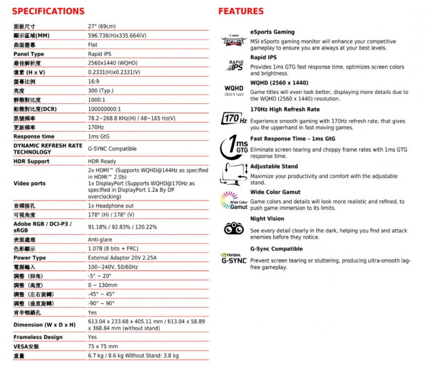 - 27" Rapid IPS液晶面板, WQHD(2560 x 1440) 高解析度, 170Hz刷新率