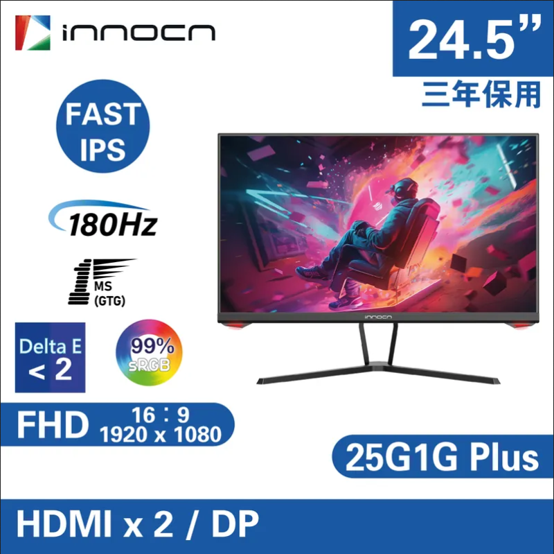 - FHD resolution(1920*1080) - Fast IPS Panel - 180Hz - 1ms (GTG) - 99% sRGB - Delta E <2 - HDMI 1.4, HDMI 2.0, DP 1.2, 3.5mm audio out - color calibration - Tilt - 556.4*423.8*204.4mm