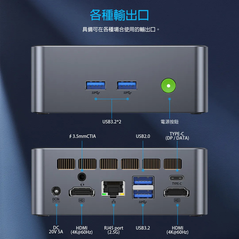 Slot : 3*USB 3.2 Gen1 / 1* USB 2.0 / 2*HDMI (4K@60Hz) / 1* Type-C (DP/DATA) / 2.5 Giga Lan(RJ45) / 1*Headphone Jack / 1* DC Port