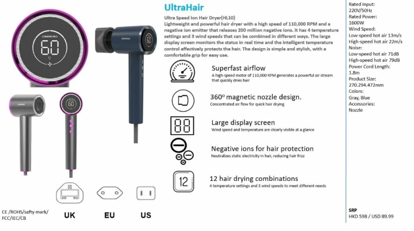 作為全球知名的科技品牌Momax,為了滿足現代時尚人士對於高效、保護頭髮的吹風體驗的需求,自豪地宣布推出最新產品系列:Momax UltraHair 負離子高速吹風機 HL10。這款強勁而輕巧的數碼吹風機將帶來無與倫比的風速和負離子護髮功能,讓您在快速乾髮的同時保護頭髮健康。