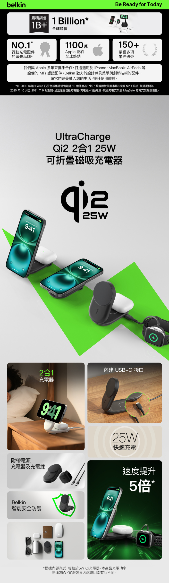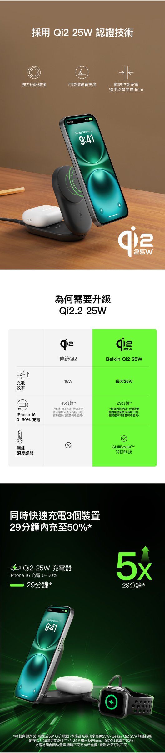 ‡基於內部測試。Belkin Qi2 25W 無線充電技術可在 29 分鐘內將搭載 iOS 26 或更新版本的 iPhone 16 電量,從 0% 充電至 50%。充電時間視乎環境因素而有所不同,實際結果可能有差異。