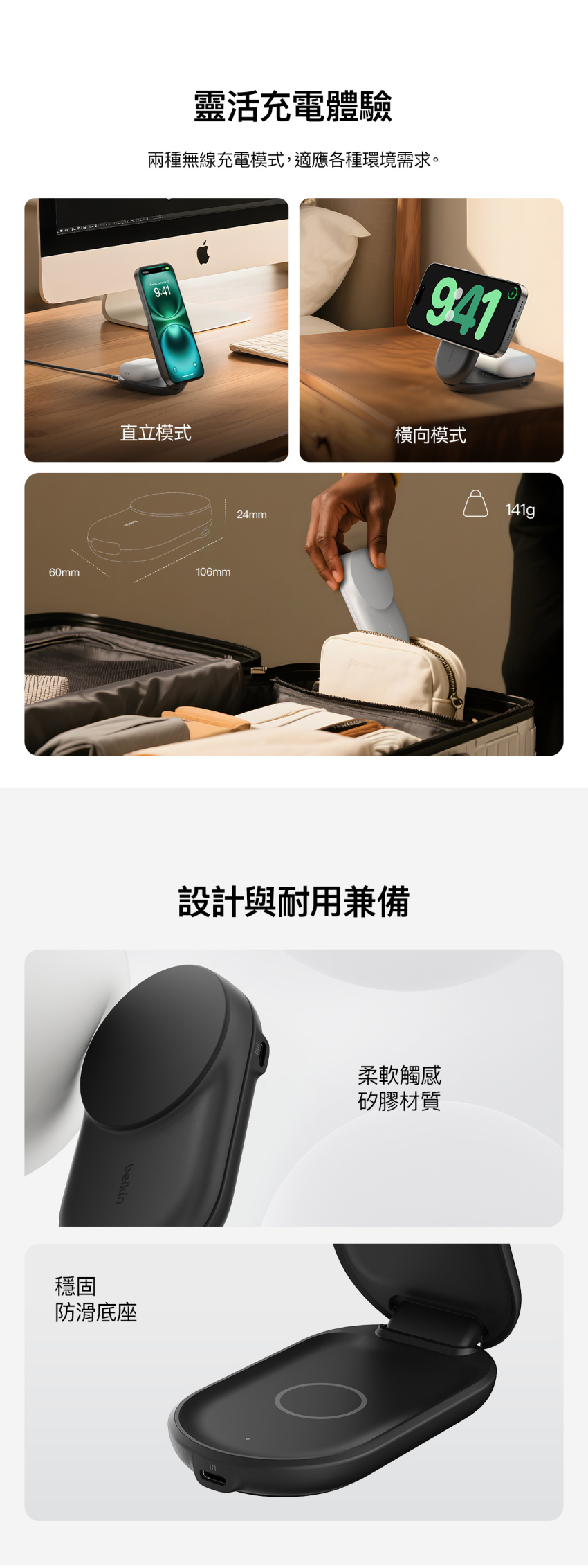 - 摺疊設計方便攜帶,輕巧便於隨身使用,隨時隨地都能將任何平面變成充電站