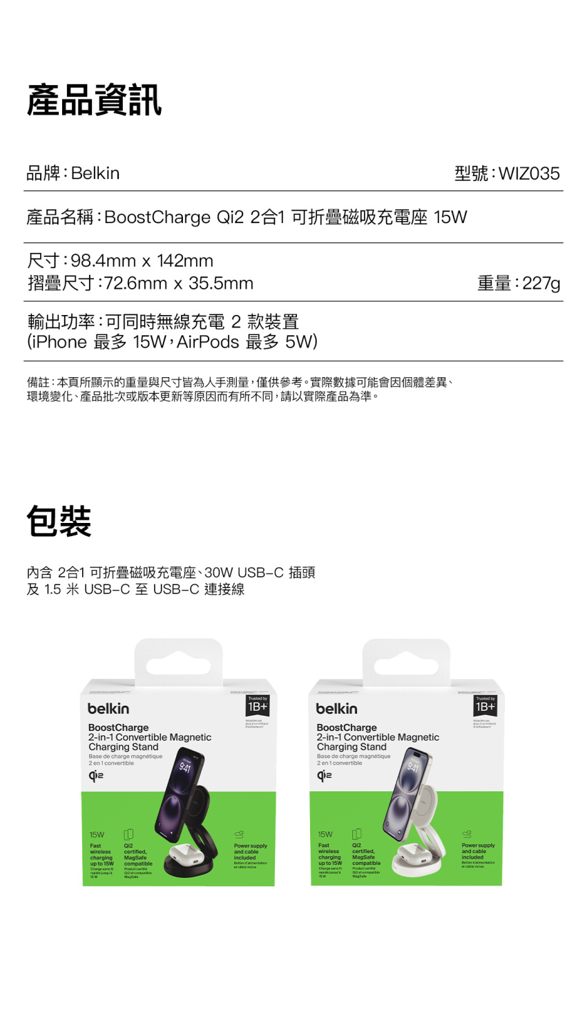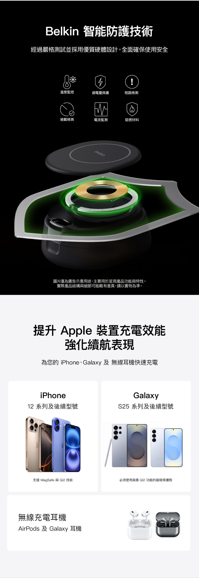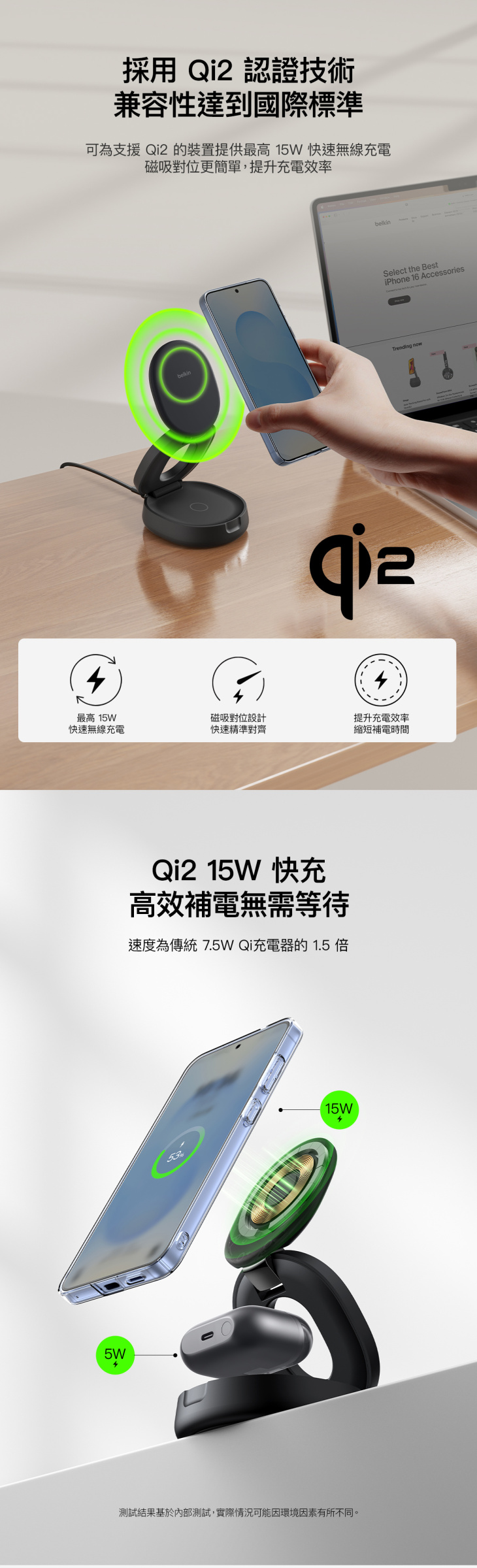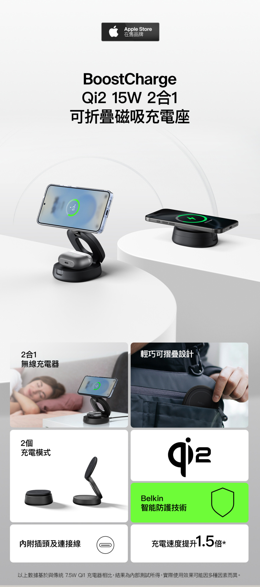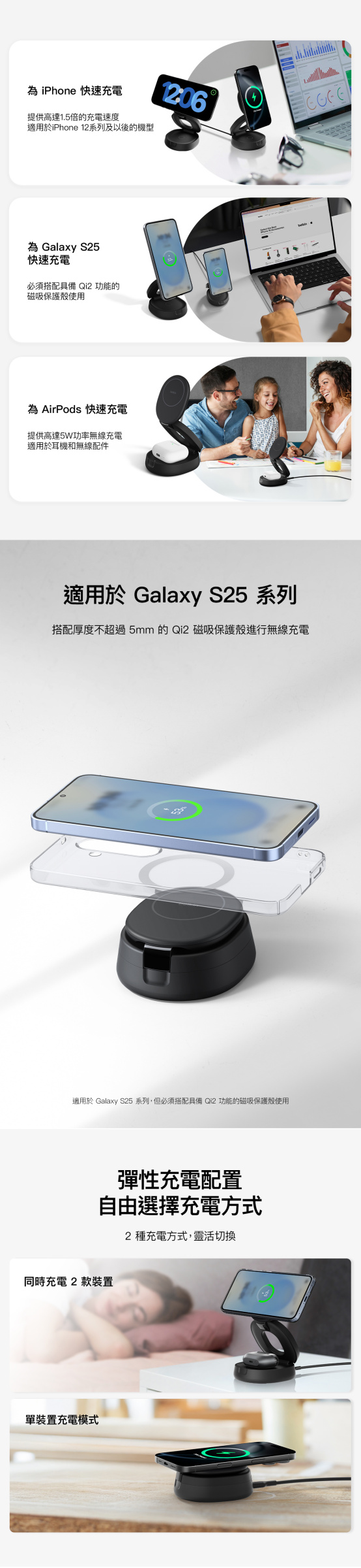 - 使用一個充電器來充電所有 Apple 裝置:使用 Qi2 (MagSafe 兼容) 以 15W 為 iPhone 快速充電,並以 5W 為 AirPods 充電