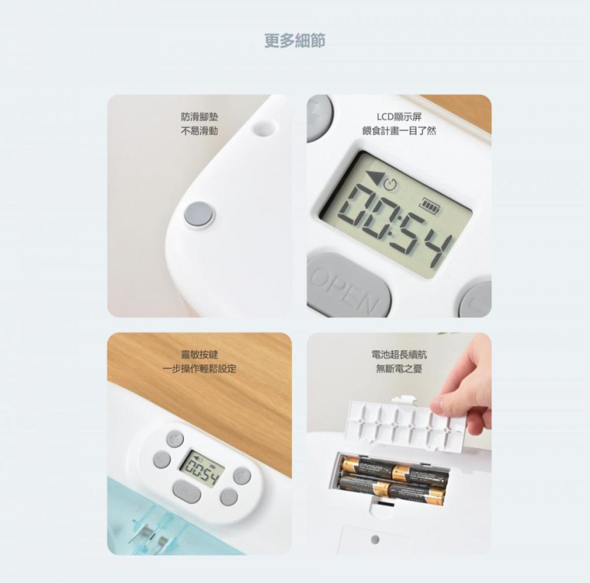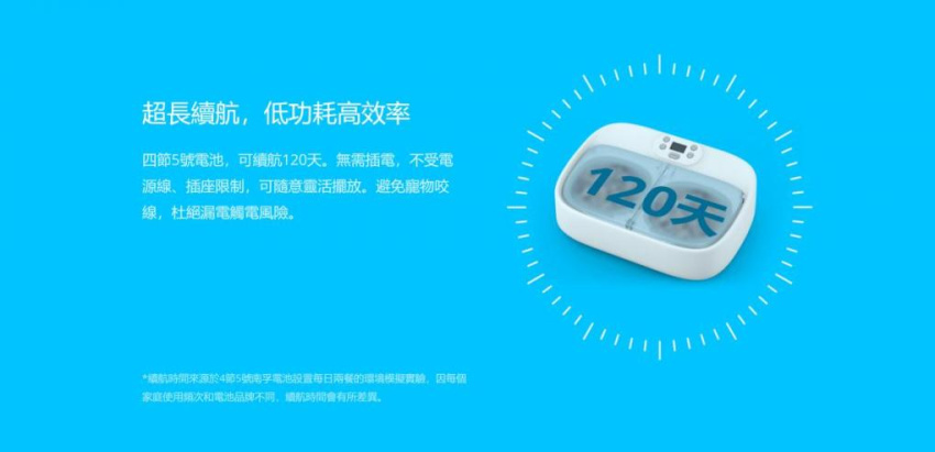 - 四節 5 號電池,可續航 120 天。無需插電,不受電源線、插座限制,可隨意靈活擺放。避免寵物咬線,杜絕漏電觸電風險