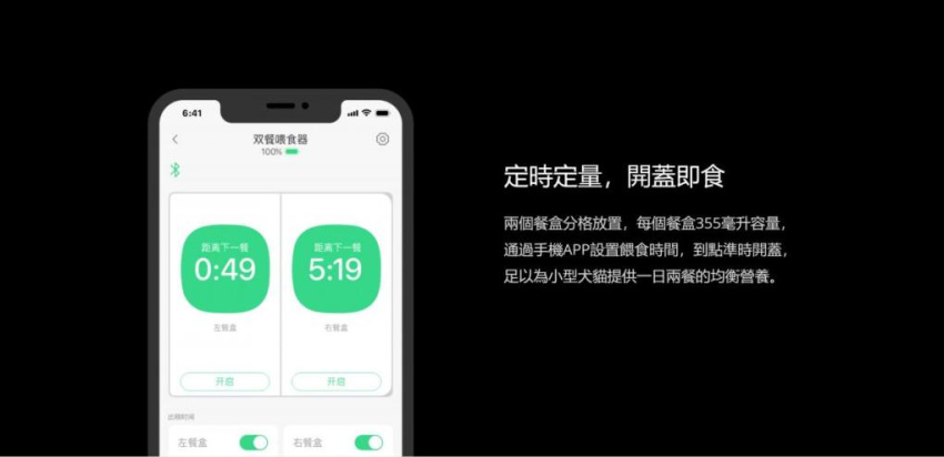 - 兩個餐盒分格放置,每個餐盒 355 毫升容量,通過手機 APP 設置餵食時間,到點準時開蓋,足以為小型犬貓提供一日兩餐的均衡營養