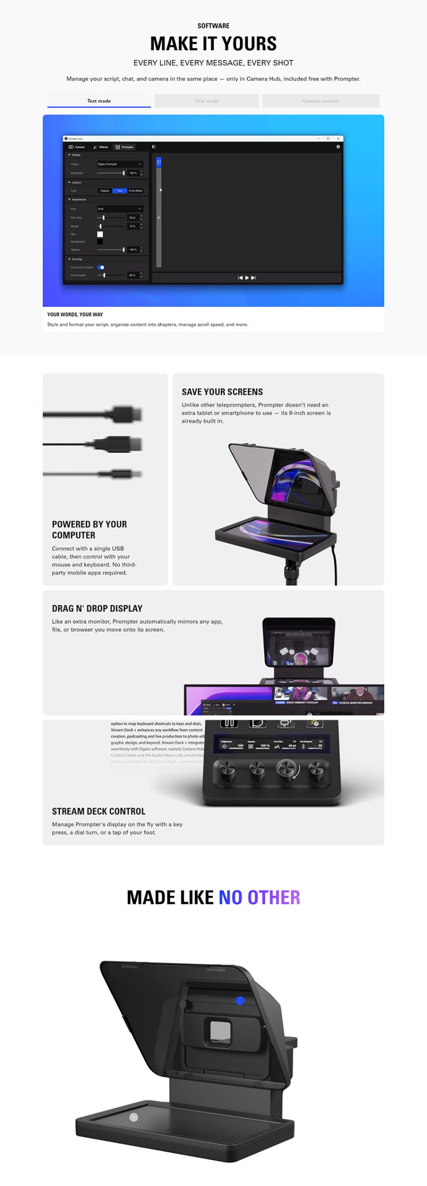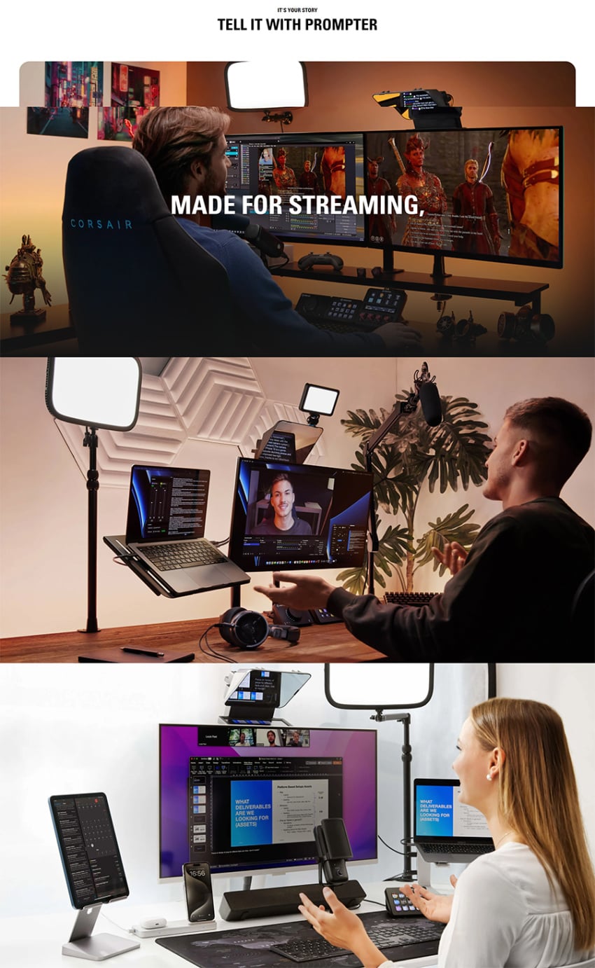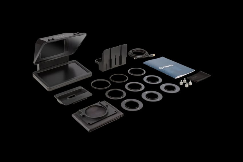 - Prompter with display, DSLR/Mirrorless backplate, 9x DSLR/Mirrorless step-up rings, Facecam Pro backplate, Universal shroud backplate, Universal bracket, Mounting screws, USB-C to USB-A 3.0 cable (200 cm | 78.7 in), Cleaning cloth, Quick start guide