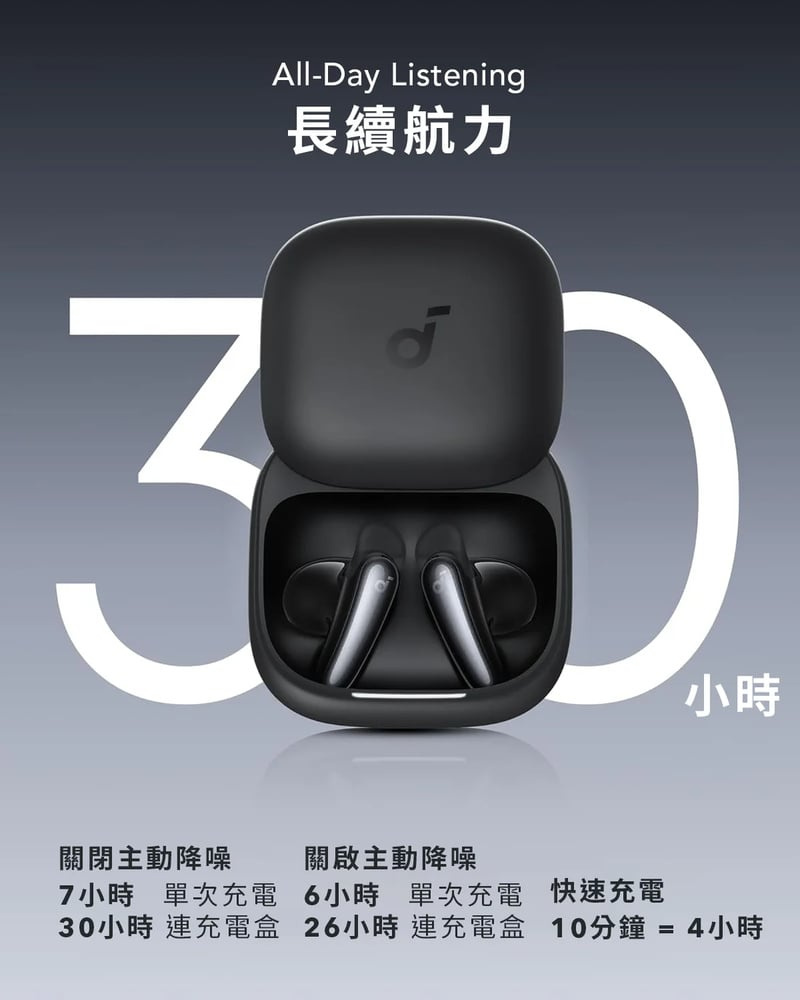 • 單次耳機可使用最長7/6小時(標準/ANC模式)