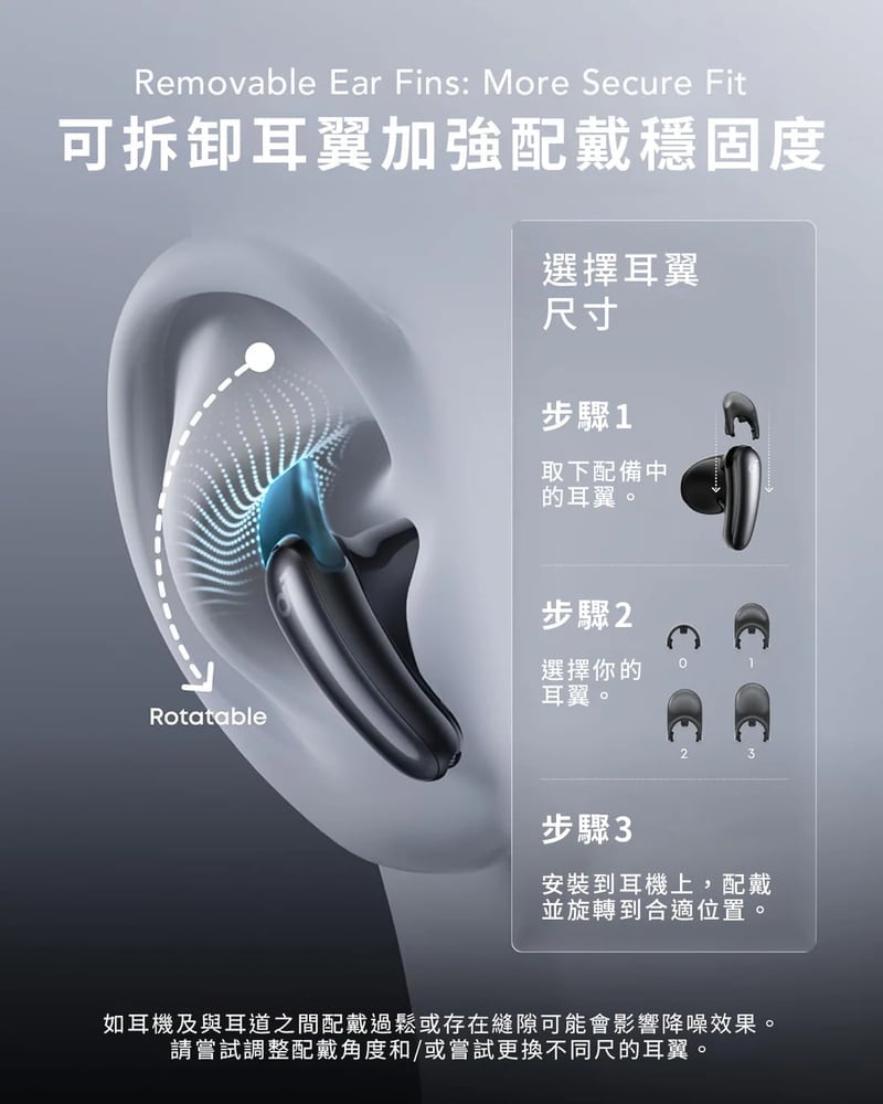 • 柔軟可更換耳翼,加強貼合度、舒適度和穩定性