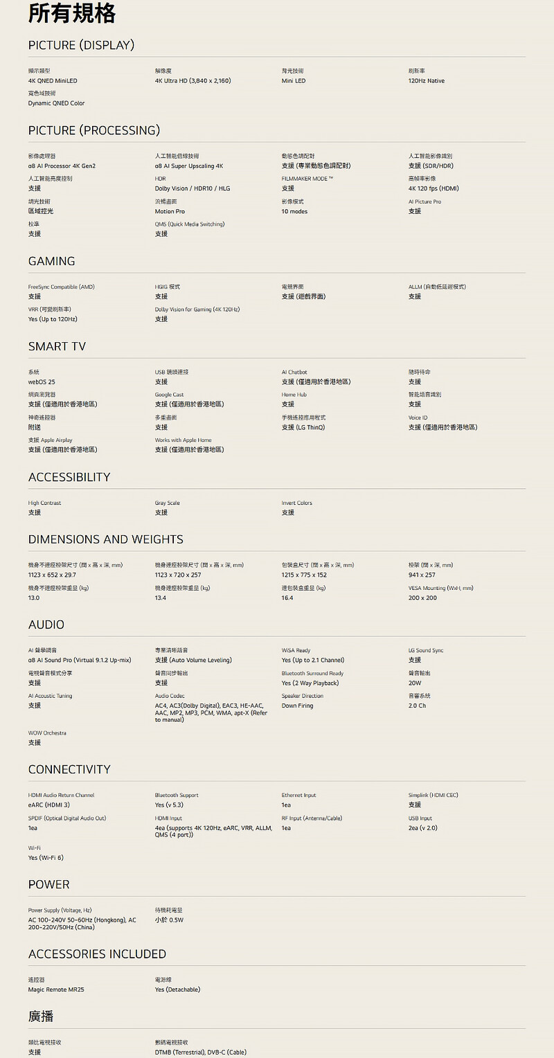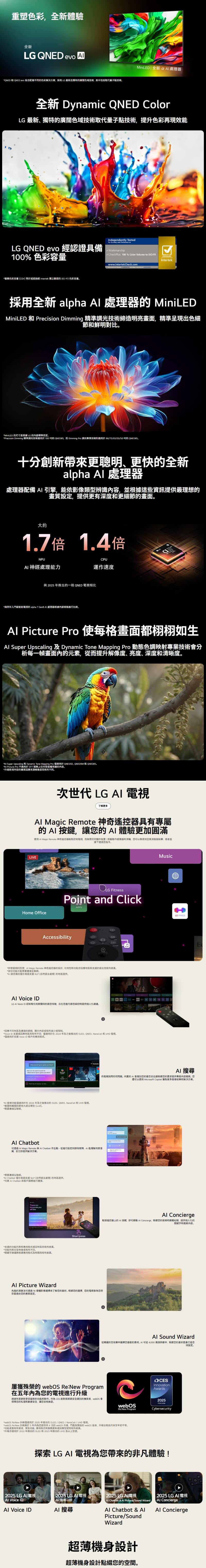 全新 Dynamic QNED Color 提供極致豐富的色彩 alpha 8 Gen2 AI 處理器提供 4K 畫質、升級影像和環迴立體音效 AI Magic Remote 配備全新 AI 按鍵,支援語音控制和拖放功能 Local Dimming 精準調光技術確保提供最清晰的影像,最細微的細節也能一覽無遺