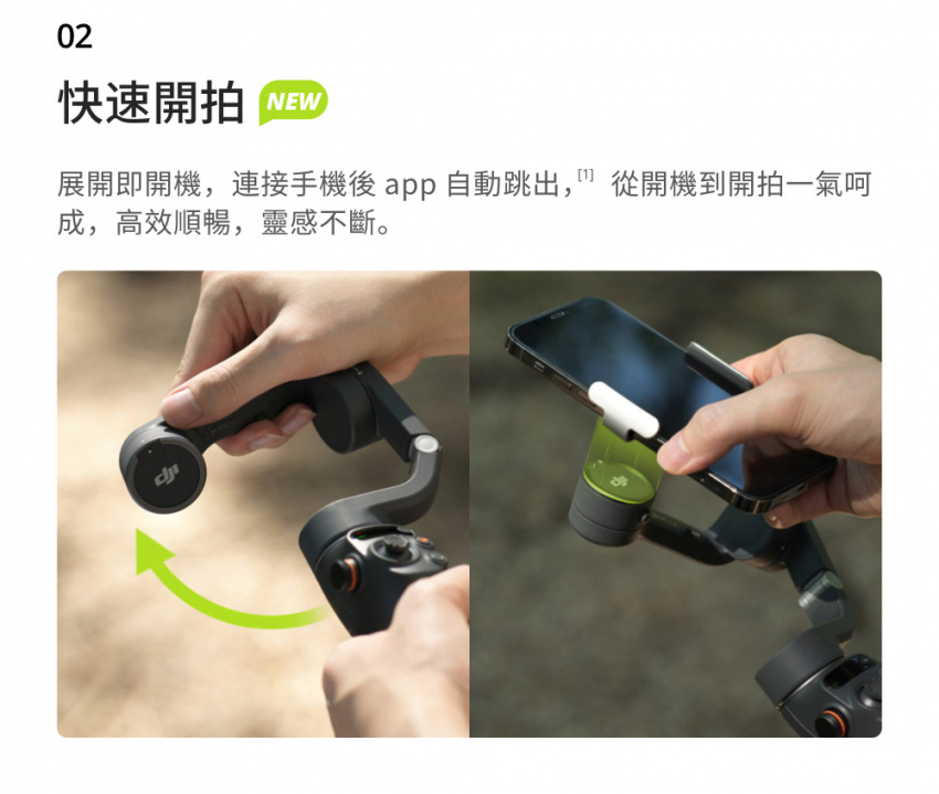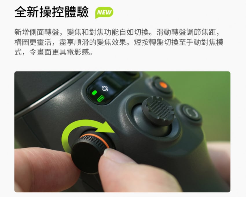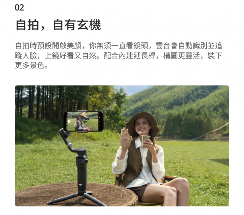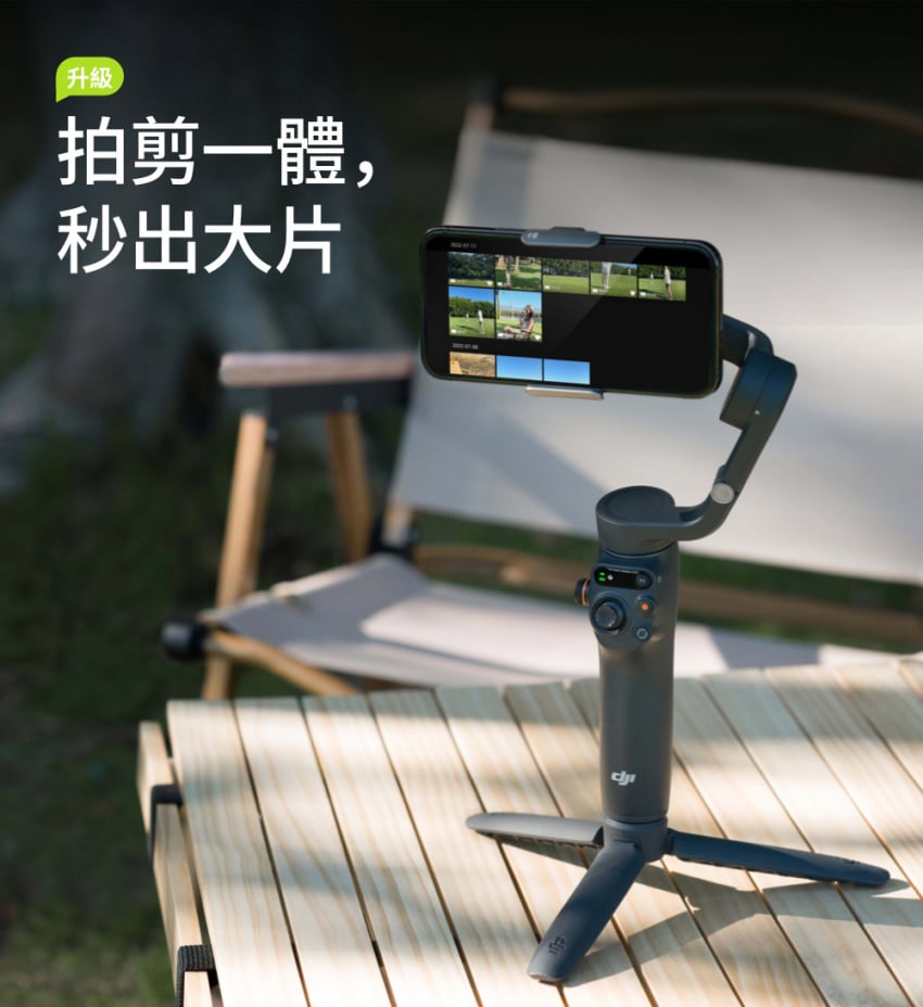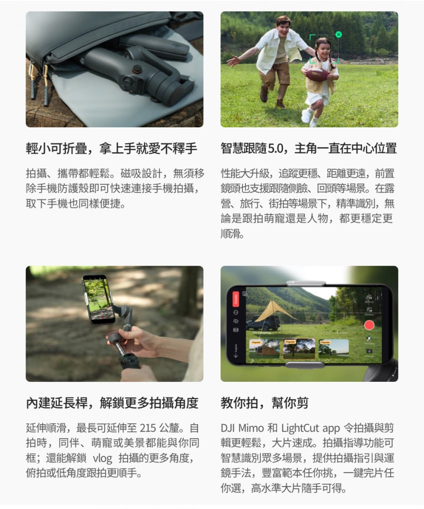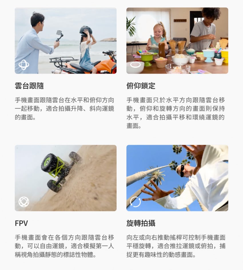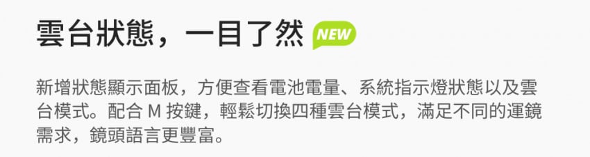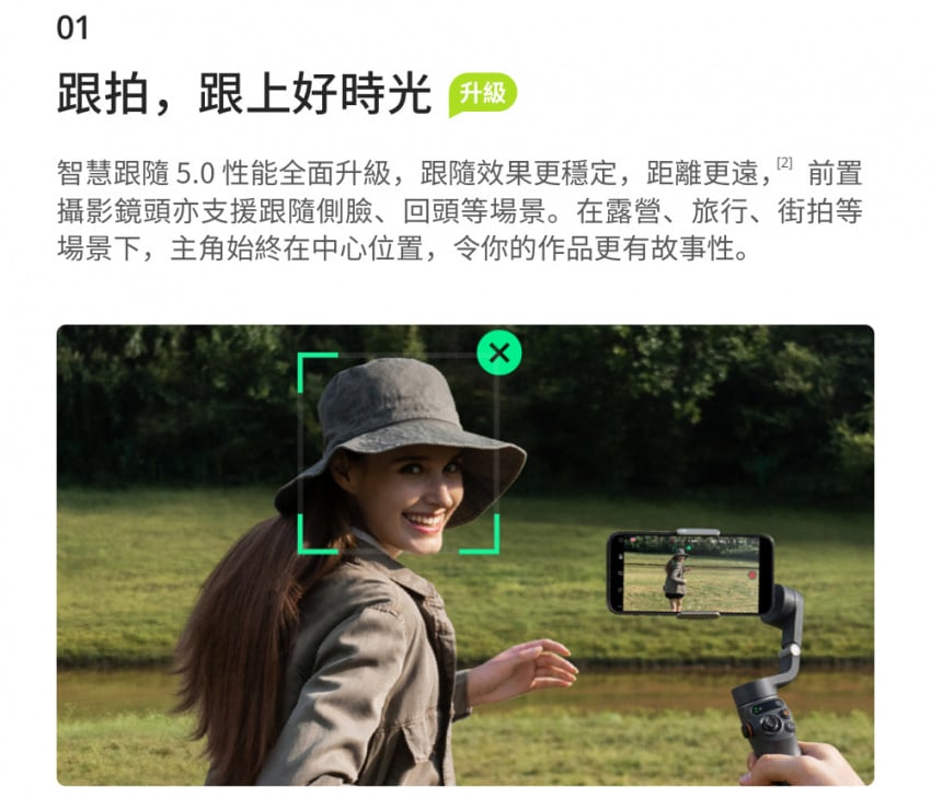 ‧升級智慧跟隨5.0 前置鏡頭支援跟拍 主角始終C位 ‧新增狀態顯示面板 電量/雲台模式一目了然 ‧全新操控體驗 新增側面轉盤 單手切換對焦/變焦 ‧展開雲台即自動開機 靈機隨行 快速開拍