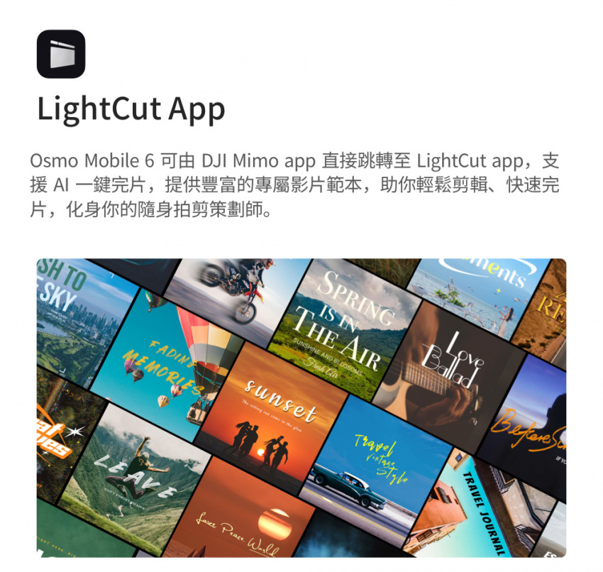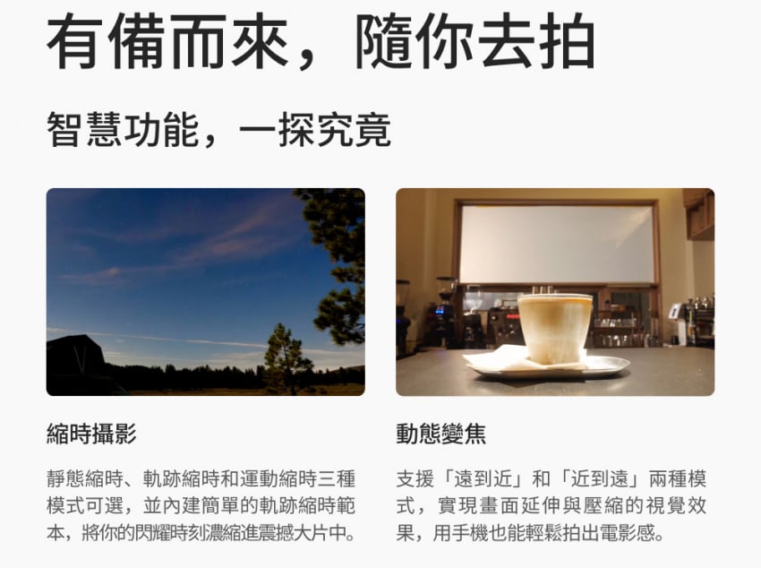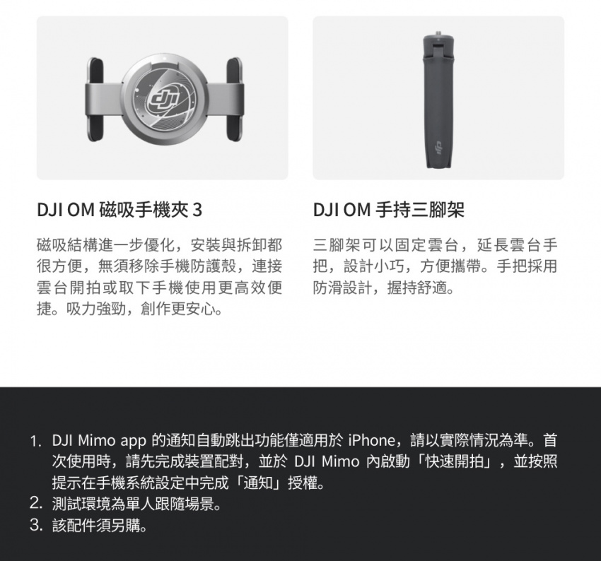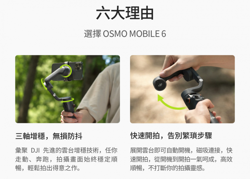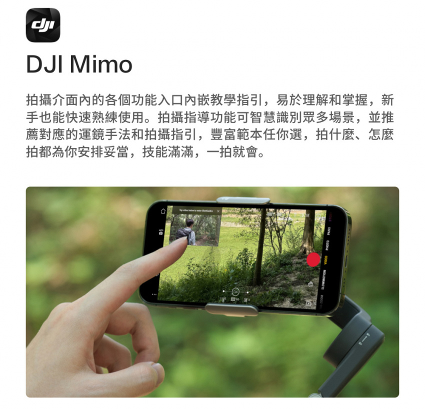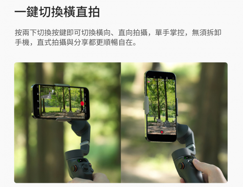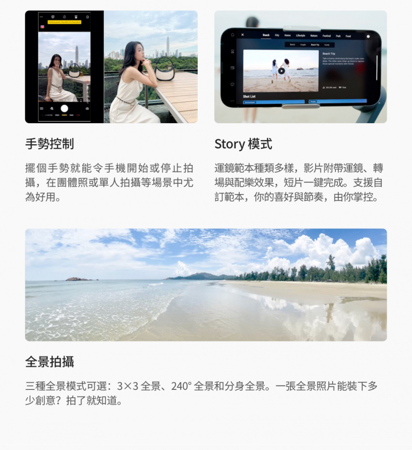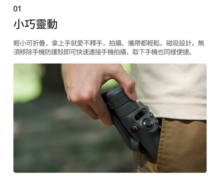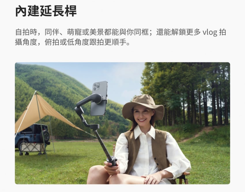‧升級智慧跟隨5.0 前置鏡頭支援跟拍 主角始終C位 ‧新增狀態顯示面板 電量/雲台模式一目了然 ‧全新操控體驗 新增側面轉盤 單手切換對焦/變焦 ‧展開雲台即自動開機 靈機隨行 快速開拍
