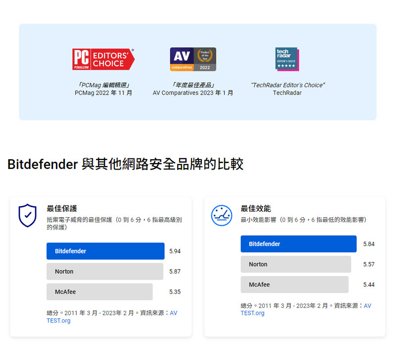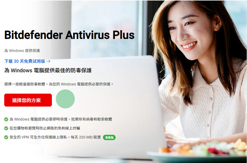 Bitdefender Antivirus Plus 是搭載了下一代網路安全性的產品,層榮獲 AV-Comparatives 頒發的「年度最佳產品」獎。它可以保護 Windows 電腦免受所有線上威脅的侵害,並包含了 Bitdefender VPN 和 Bitdefender Safepay 等隱私工具。