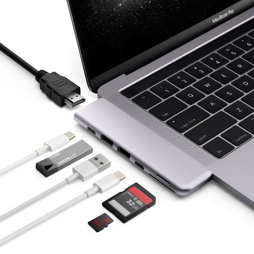 This exceptionally compact, elegant adapter truly is the perfect companion for Apple MacBook Pro. Featuring a total of seven ports that can all be used simultaneously – HDMI, 2 x USB 3.0, Thunderbolt 3, USB-C, and Micro SD and SD card readers.