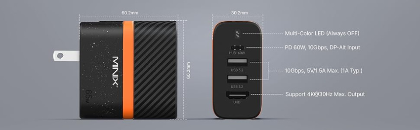 Discover unparalleled versatility with our charger's array of ports. Two USB 3.2 Gen 2 ports, boasting 10Gbps transfer speed, ensure seamless data transfer and charging for your devices. Plus, the USB-C 3.2 Gen 2 port with PD 60W Max Charging support empowers you with high-speed, multi-functional connectivity.