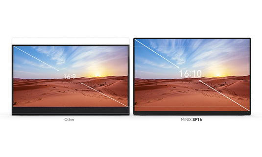 MINIX SF16/SF16T, a 16" HD touch screen monitor elevating visual experiences with its stunning 100% sRGB Vivid color spectrum. This immersive display delivers lifelike hues and precise color accuracy, perfect for design, gaming, and content creation.
