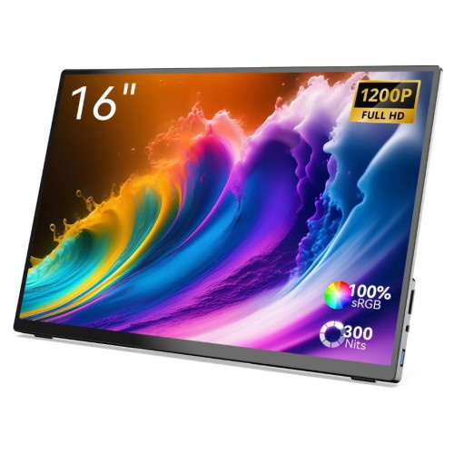 16" HD Portable Monitor 2 x USB-C Inputs, 1 x HDMI Input, 3.5mm Audio Jack, 2 x 1W Speakers