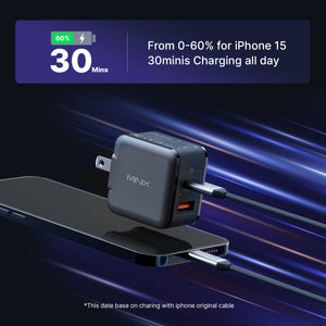 A tiny 33W GaN charger redefining speed. Charge the latest iPhone 15 from 0 to 60% in just 30 minutes. Compact, powerful, and perfect for your fast-paced life.