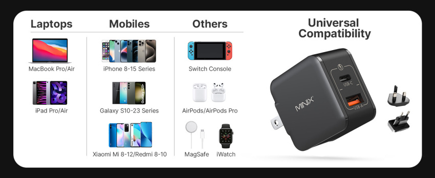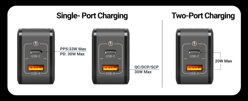 Versatile Compatibility. Supporting various Quick Charging Protocols like PD 3.0, PPS, QC4+, QC 3.0, Samsung AFC, Huawei FCP/SCP, Apple 2.4A, it accommodates most 30W/33W PPS-compatible devices. Equipped with adapters for UK, EU, and US sockets, ensuring seamless charging across different regions.