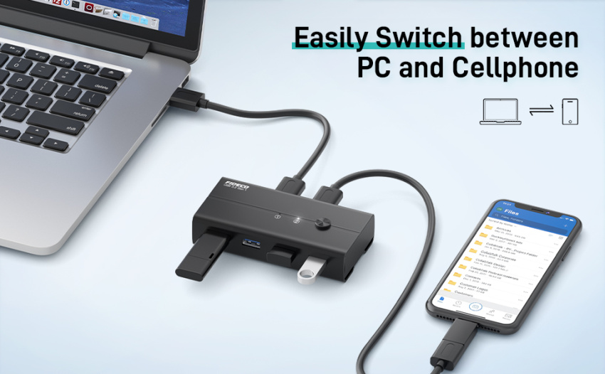 FIDECO USB KM switch is, essentially, a 2-port input and 4-port output USB hub, which can enable 2 computers to share up to 4 USB peripheral devices. It can definitely help you work with 2 computers simultaneously by just pressing the switch button to switch between 2 computers seamlessly.