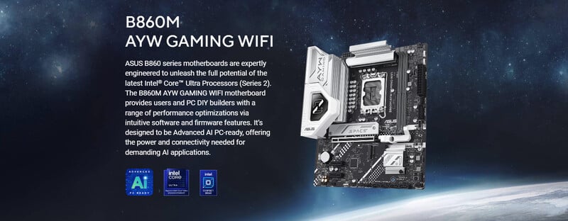 • 主機板 : Asus B860M-AYW GAMING WIFI M.ATX ,DDR5, 2.5GbE , 5Gbps USB Type-C® , Wi-Fi 6+Bluetooth v5.3, LGA1851, mATX M/B