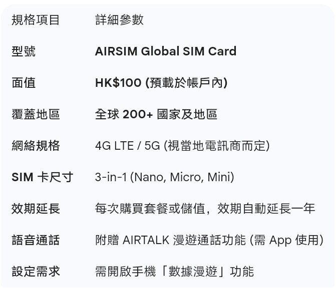 📞 贈送 30 分鐘 AIRTALK: 大部分套餐均附贈 30 分鐘語音通話,讓您在國外也能輕鬆致電當地餐廳訂位、或打回香港與親友聯繫。