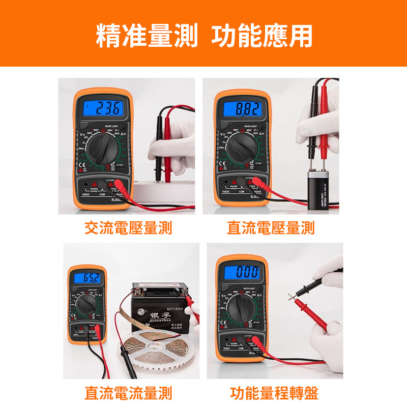 包裝清單:主體(帶矽膠保護套)、紅黑表筆、9V電池、英文說明書