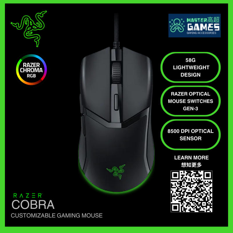 Razer Cobra 有線遊戲滑鼠適合休閒與競技玩家。競技玩家將會喜愛超靈敏的第三代光學開關和高精度感應器,而休閒玩家則會享受這款輕量化、舒適的設計,使長時間的遊戲變得輕鬆。RGB 愛好者將會愛上可自定義的 Razer Chroma 燈光,該燈光可與其他 Razer 設備及兼容遊戲同步,帶來身臨其境的遊戲體驗。無論您是在 FPS 中戰鬥、探索 RPG 世界,還是帶領您的團隊在 MOBA 中取得勝利,Razer Cobra 有線遊戲滑鼠都能為您提供所需的性能與自定義功能,幫助您在遊戲中大放異彩。