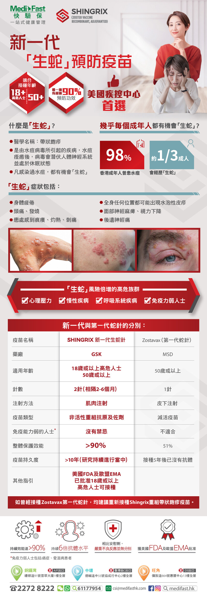 - Shingrix是唯一擁有超過90%預防功效的帶狀皰疹疫苗,能預防「生蛇」及「生蛇」引起的後遺神經痛,並降低其他併發症的風險增加