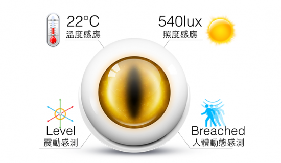 為了面對家裡各式狀況,Motion Sensor 除了能感應物體接近外,還集合四種感應功能。迷你的裝置可偵測周圍的溫度、人體動態、亮度及產生的震度。在 Motion Sensor 的注視下,任何火災、企圖入侵家中、破壞或其他威脅。搭配整體系統,更能擴展生活更多便利性與舒適性。
