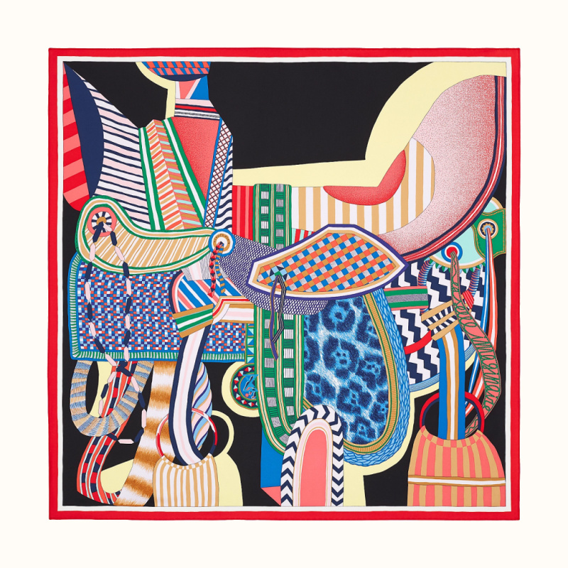 埃米爾·愛馬仕(1871-1951)是一位品位獨到的美學家,也是一位孜孜不倦的古董收集者。他收集了一大批奇珍異寶,如今都被愛馬仕精心收藏著。這些藏品為揚·巴吉特裡可(Jan Bajtlik)提供了豐富靈感,促使他設計出這款樣式新穎的馬鞍。編繩、螺旋飾帶以及巧妙的透視效果賦予了這件馬鞍生動的輪廓。豐富多樣的花紋喚起了一種異國風情,並激發了遠遊的渴望。正如以往一樣,設計師也讓他的小狗Kluska“藏身”在這款絲巾圖案中。您能找出它嗎?